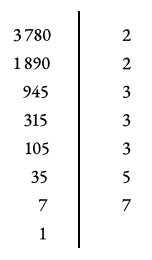 Ainsi \(3 780 = 2 × 2 × 3 × 3 × 3 × 5 × 7 = 2^2 × 3^3 × 5 × 7\)